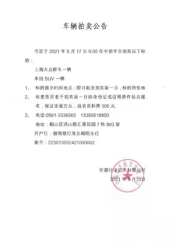 車輛拍賣公告 2021-09-10 11:29 上一篇:淮北市杜集區(qū)(高新區(qū)北區(qū))科創(chuàng)園(一期電子信息產(chǎn)業(yè)園)49號地塊基礎(chǔ)設(shè)施建設(shè)項目規(guī)劃方案編制項目招標(biāo)公告(邀請招標(biāo)) 下一篇:楊河北路路燈供電項目招標(biāo)公告 返回列表